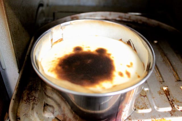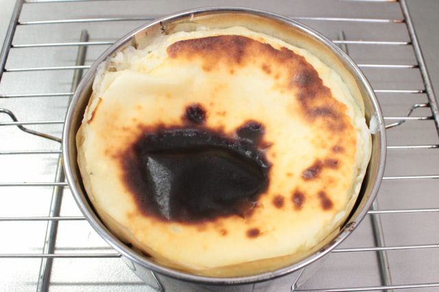 6分ほど焼くと、表面の一部にバスクチーズケーキらしい焦げ色が付きました。トースターに焼きムラがあるようで、全面をきれいに焼けないのが残念!