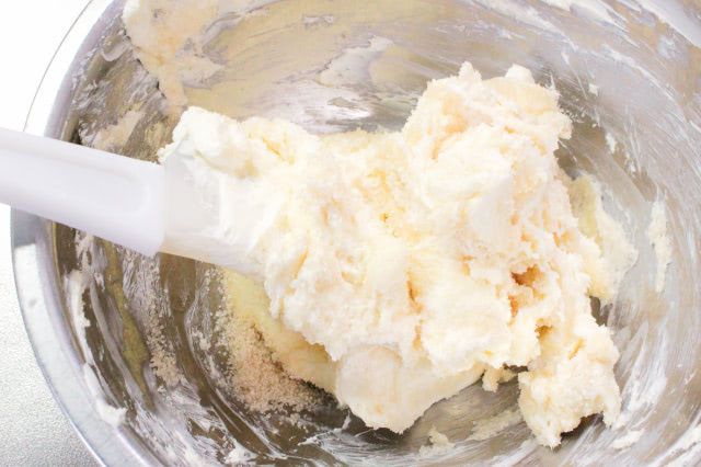 砂糖の粒感がなくなるように混ぜます。砂糖が混ざってくるとクリームチーズがやわらかくなって、混ぜやすくなりますよ。