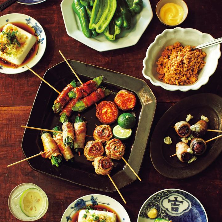 串に刺してあるだけで、ぐんと楽しくて気分が上がる串焼きは、気取らずに食べられてお酒も進む最強のおつまみ。相性の良いものを何でも気軽に巻き、フライパンで焼くだけだから簡単で失敗知らずです。