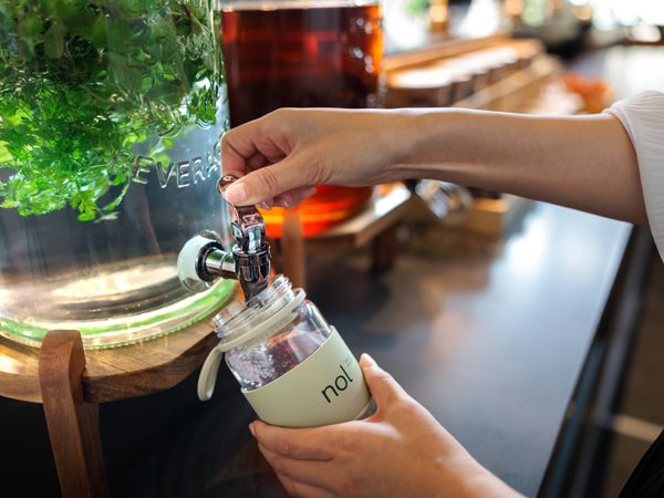 ロビーラウンジでは、自家製デトックスウォーターをはじめコーヒーや紅茶など10種類以上の飲み物がフリーフローで楽しめます。宿泊者にプレゼントされるオリジナルタンブラーに注げば滞在中から持ち運びが便利で、日常使いまでできる嬉しいノベルティ!