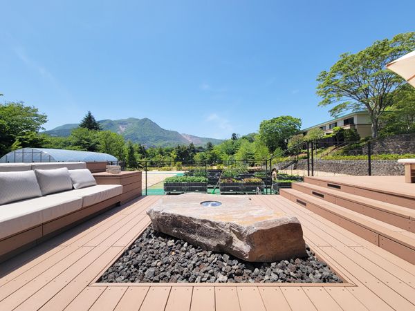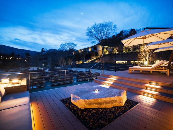 早雲山・小涌谷を臨む「フォレストテラス」。夜には炎が灯り癒やし空間に