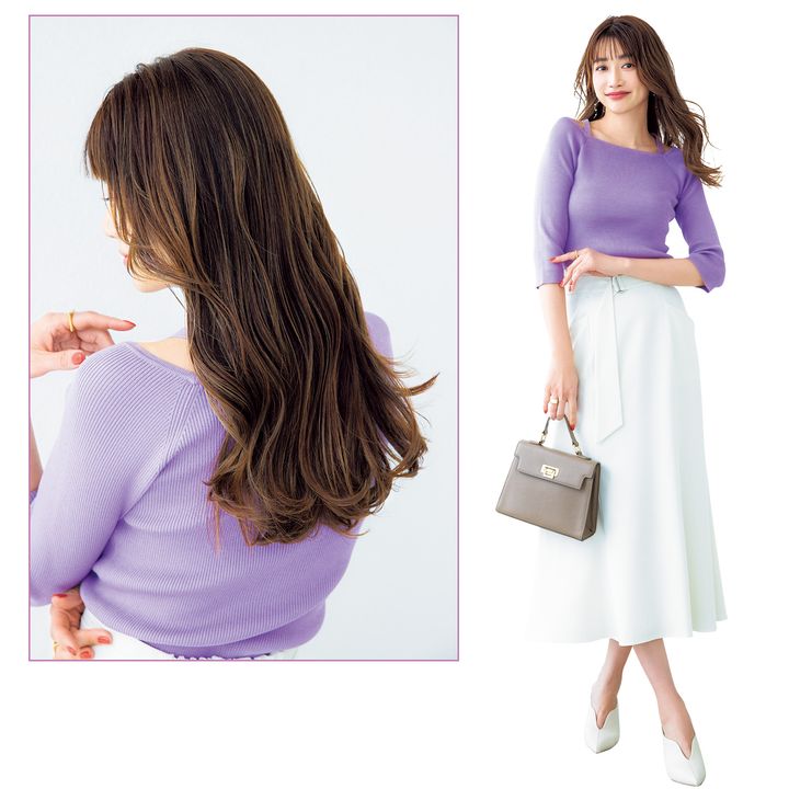 ニット¥15,400、スカート¥14,300(ともにストロベリーフィールズ/シュガー・マトリックス)ピアス¥29,700〈Pearl for Life〉リング[右手]¥23,100〈スキャット〉リング[左手]¥19,800〈masae〉(すべてロードス)バッグ¥3,490(神戸レタス)パンプスはスタイリスト私物