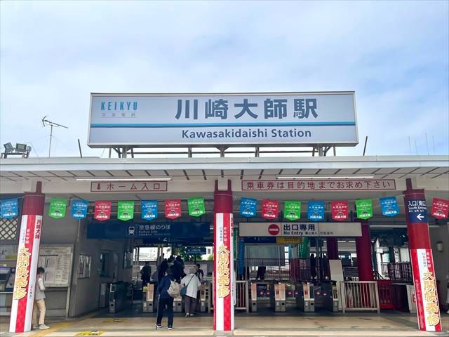 京急品川駅から、京急大師線に乗り換え、最寄りの川崎大師駅へ。駅構内には大開帳を伝えるポスターやフラッグが並び、すでに盛り上がりを感じます。筆者は11時の回を狙って、10時頃に川崎大師へ到着しました。