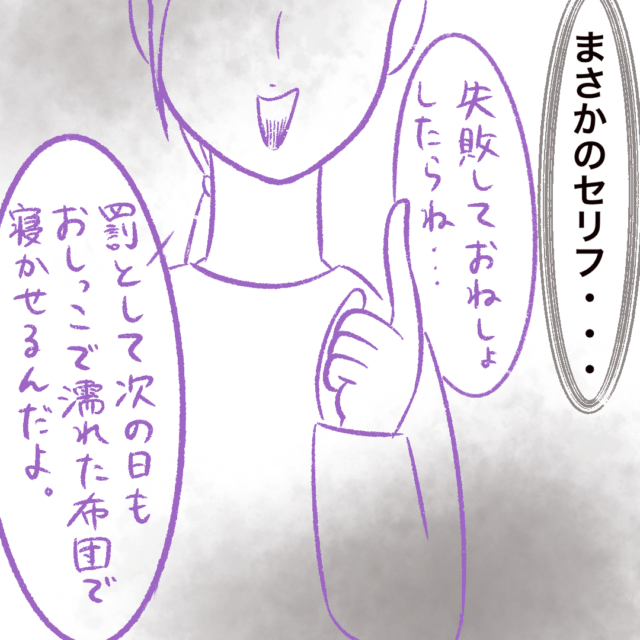 2歳になったばかりで1人でトイレに行けるさあやちゃんを褒められたさあやちゃんママは「うちは自立させてるから!」とドヤ顔。夜ももうおむつが外れていることについて「すごぉー!どうやったんですか?」と聞かれて誇らしげに教えたのは・・・「失敗しておねしょしたらね、罰として次の日もおしっこで濡れた布団で寝かせるんだよ」というとんでもない方法で・・・。