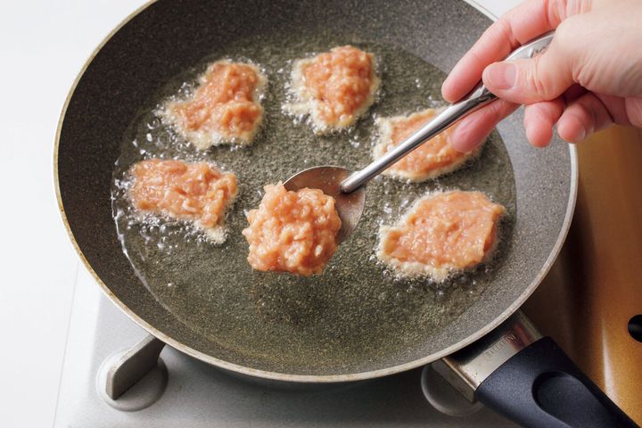 肉だねは柔らかいので、大きめのスプーンですくって油に落とし入れます。すぐに上下を返すとたねがばらばらになるので、しばらくさわらずに揚げるようにしましょう。