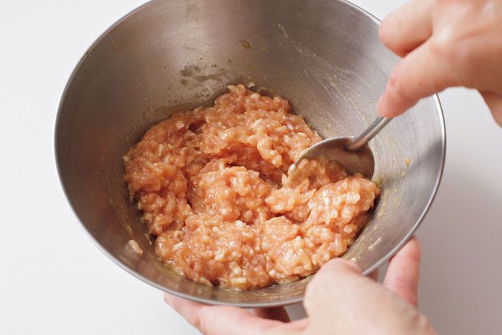 (1)ボールにひき肉と〈A〉を入れてスプーンでよく混ぜ合わせ、肉だねを作る。小さい器に〈チリソース〉の材料を入れてよく混ぜる。
