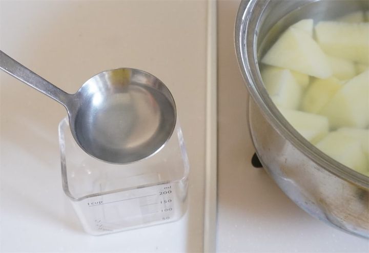 3.新じゃがいもが柔らかくなったら、茹で汁を50ml取り分け、ザルに上げてお湯を切る。