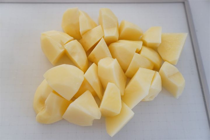 2.新じゃがいもは皮をむいてひと口大に切る。鍋に湯を沸かして新じゃがいもと塩を入れて茹でる。