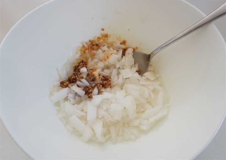1.玉ねぎはみじん切りにしてボウルに入れ、[A]と混ぜる。