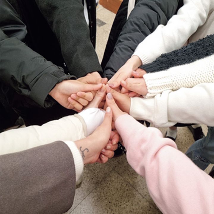 終業式後、歌サークルのみんなでお疲れ様の円陣を組んで記念撮影。