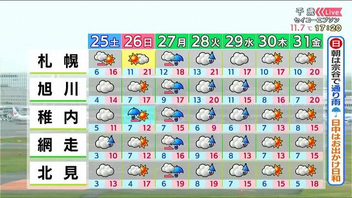 26日(日)の朝は稚内で通り雨がありますが、日中は各地で晴れ間がありそうです。