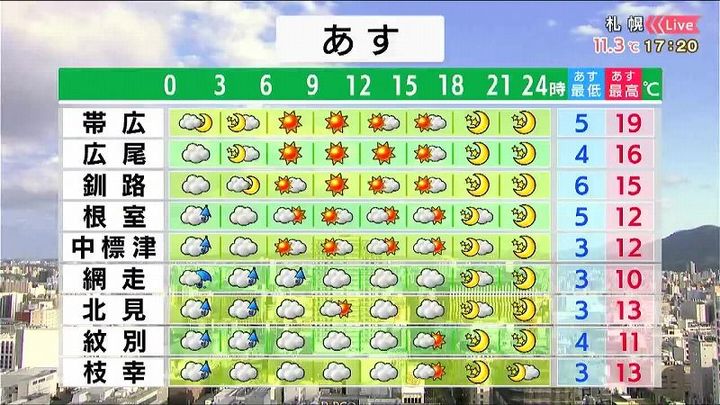 未明は上川地方で雨の降る所がありますが、日中は日のさす時間もありそうです。