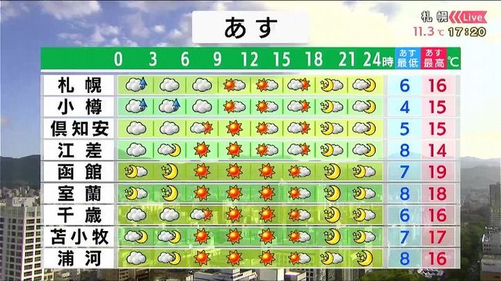 早朝まで札幌や小樽で弱い雨が降りますが、日中は各地で晴れるでしょう。風のやや強い状態が続きそうです。