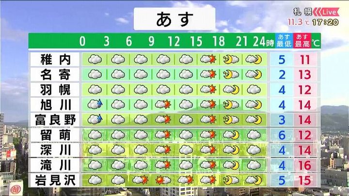 日中の寒さも幾分和らぎ、札幌は21度まで上がる予想です。