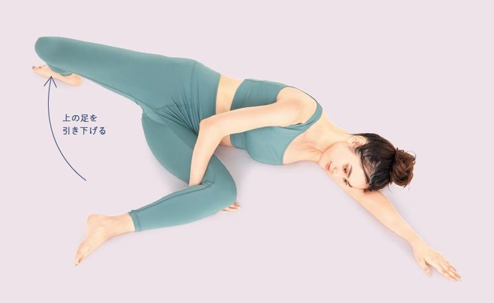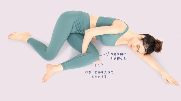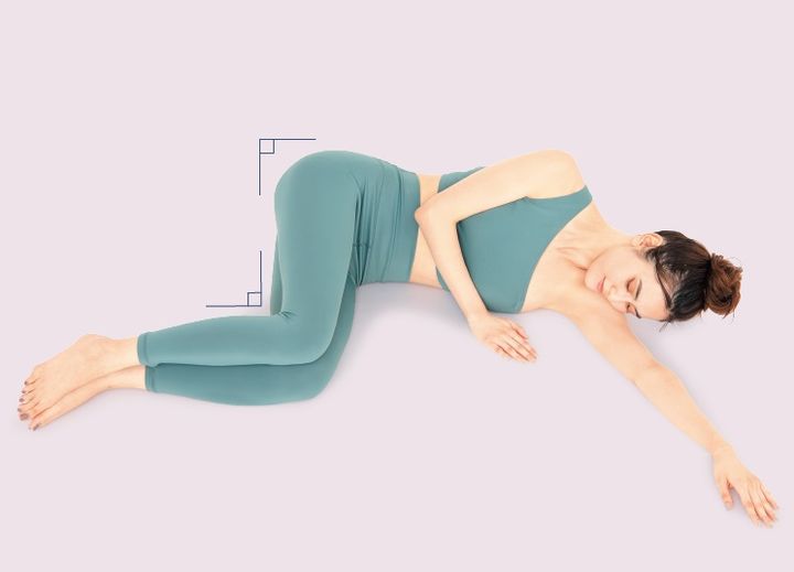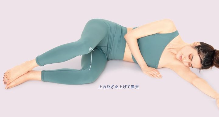 1、左側面を下にして横向き寝。股関節とひざを直角に曲げたら右手を左ひざ裏に通し、左脚が動かないように右手で床を押さえる。