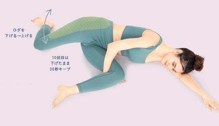 3、右足を床につけたまま右ひざの上げ下げを10回。10回目にひざを下げたまま30秒キープ。外ももの伸びを感じて。反対側も同様に。