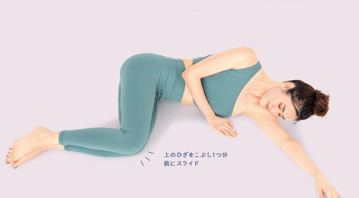 1、左側面を下にして横向き寝。股関節とひざを直角に曲げる。左手は斜め前に出して顔を支える。右ひじは軽く曲げて右手を床に。