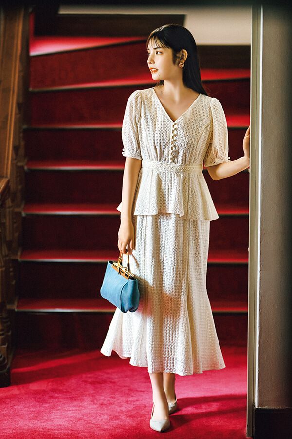 清涼感たっぷりのホワイトレースは、気温が上がってくるこれからの季節にジャスト! セットアップ見えするペプラムデザインで、今年らしい洒落っ気をまとって。