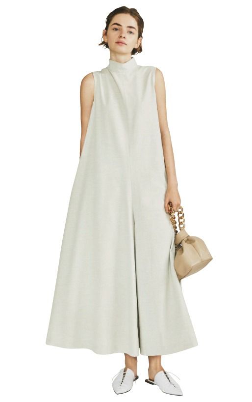 ライトグレーオールインワン /l’heritage Martinique(マルティニーク ルコント ルミネ有楽町) 縦のラインを助長する「ハイネック+マキシ丈」。見た目はフレアワンピース。ドレスのような風格で、フォーマルにも活躍しそうなオールインワン。肩が露出するキャミ・ノースリタイプで、肌感によって抜けをつくることで、膨張を防ぎつつナチュラルな女性らしさを演出。体のラインをキレイに見せてくれるので、スタイルアップにも直結。
