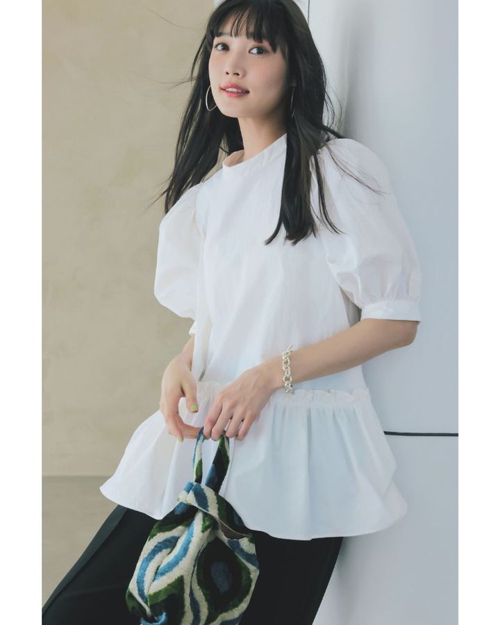5月23日(木)、着膨れしがちな白ブラウスは、ティテールと着こなし次第でスタイルアップが叶う便利なアイテム。体のラインを拾わないオーバーサイズのペプラムブラウスなら、気になる二の腕やお腹、腰回りまで上手にカバーしてくれます。さらにボトムスはセンタープレス入りの黒パンツで縦ラインを強調すれば、すっきり引き締まり好バランスに。仕上げにキャッチーなバッグでブラウスの甘さを抑えつつ、大人の遊び心を演出するのがコツです。