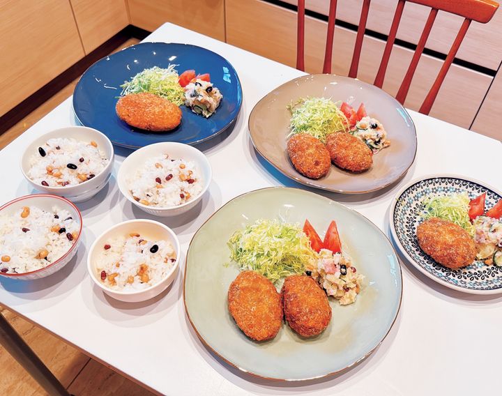平日は夕ご飯がメイン。ご飯とお味噌汁にたんぱく質と食物繊維をバランス良く。この日は休日のお昼。ご飯とポテトサラダにお豆を入れました。足りないときは豆乳を飲みます。