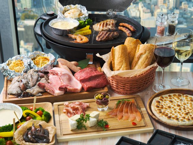 あべのハルカス58階のハルカス300(展望台)にある天空庭園のカフェダイニングバー「SKY GARDEN 300」では、高さ約300mの絶景を眺めながらオープンエアな環境でBBQができる「ハルカスでソラメシ食べるで↑BBQ」を開催。今年は「キャンプ」の雰囲気が味わえる2種類のプランがスタンバイしています。キャンプ風BBQの「カジュアルプラン」は、牛カルビや豚バラ肉、粗挽きウインナーに加え、人気のタンドリーチキンがラインアップ。グランピング気分が楽しめる「プレミアムBBQプラン」(写真)は生ハムやスモークサーモンなどのオードブル盛り合わせやチーズフォンデュ、ハッセルバックポテトなど、ラグジュアリー感のある内容に。より一層キャンプの雰囲気を楽しめるように本格的なキャンプアイテムも設置しています。
