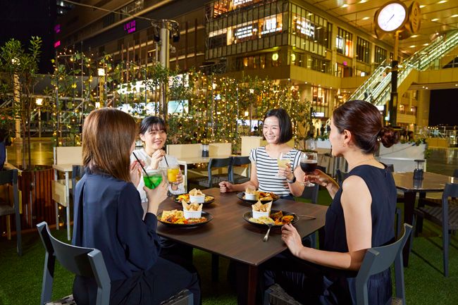 JR大阪駅5階の時空の広場内にある「バール・デルソーレ」で、雨を気にせず楽しめるビアテラスがオープン。10種類以上のメニューが盛り付けられた「ビアテラスオリジナルプレート」に飲み放題(90分)がついて3,500円とリーズナブルな価格設定が魅力。ドリンクは、生ビールやワインのほか、種類豊富なカクテルやハイボールのほかに、ノンアルコールドリンクも豊富にスタンバイ。待ち合わせや移動の合間など、グループだけでなく1人でも気軽に利用できる雰囲気です。