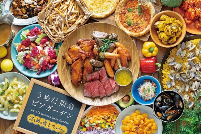 阪急うめだ本店の13階の屋上広場では、緑あふれる空間でマルシェのような雰囲気が楽しめるビアガーデンを開催中です。メインには豪快なチキンレッグが1人1本スタンバイ、その他にオシャレなデリメニュー、フライ、ピッツァ、スパイスカレー、パエリアなどを食べ放題で楽しめるほか、デザートには5種類のフレーバーから選べるカキ氷が登場。毎年好評の有名メーカーが期間限定で登場する「POP UPブース」では、その時期だけの特別なアレンジドリンクが飲み放題に! 時期によって内容が違うので、詳細はHPで確認を。また、定期的に回ってくるマルシェカートでは、オプションで全国各地のクラフトビールも販売。アルコールが苦手な人も楽しめるよう、ノンアルコールや低アルコールも充実しているので思う存分楽しんで。