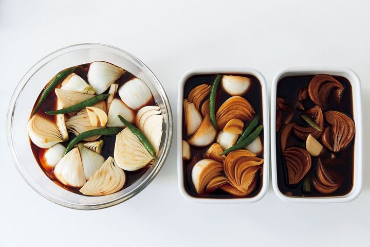 新玉ねぎは縦6等分のくし形切りにする。にんにくは縦半分に切ってしんを取る。大きめの保存容器に〈漬け汁〉の材料を混ぜ、新玉ねぎを加える。室温に一晩置く。
