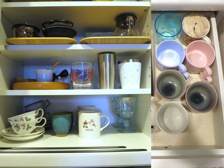 来客用のものも場所を取っていて、そもそも近年来客などほとんどなくもったいないと思っていたので、せっかくだから普段使いしようと、他のコップ類とあわせて数を絞ることに。使う頻度やお気に入り度で判断して、少しずつ間引いていきました。