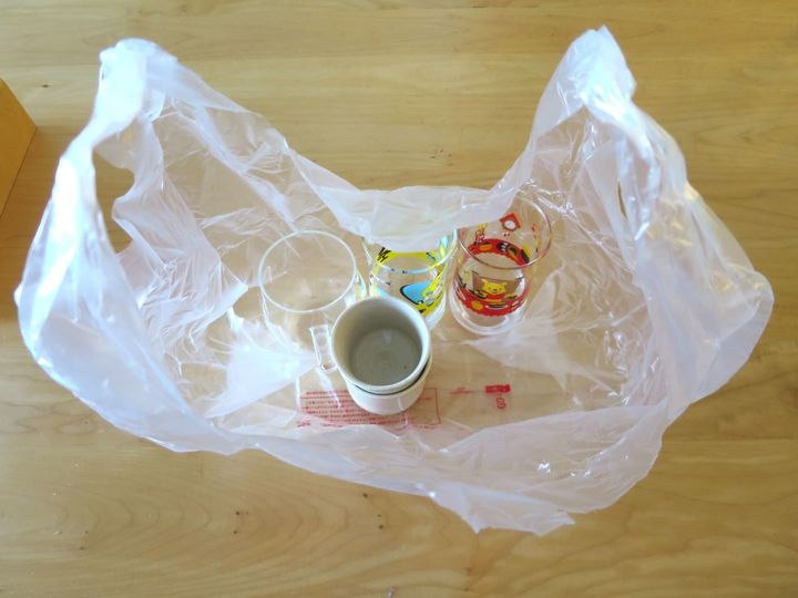間引いたコップは一旦袋にまとめて、わが家のゴミ一時置き場に置いておきます。これらがない状態でも問題なくすごせることがわかったら、後悔なく処分することができます。