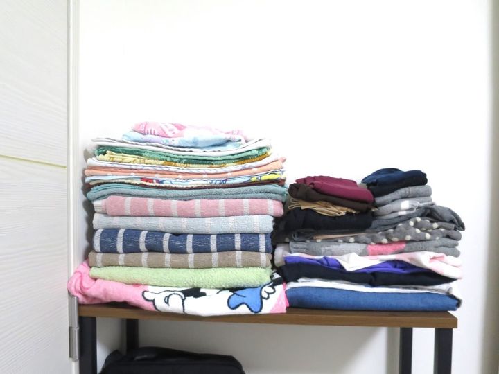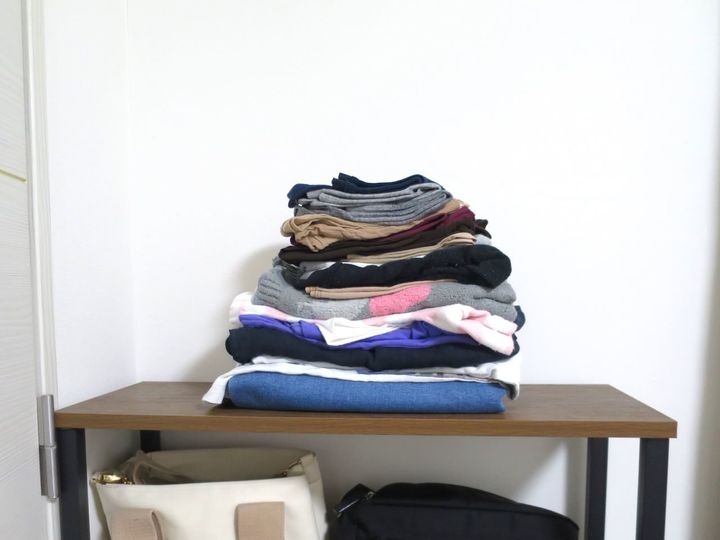 間引いたモノは、処分する予定の他の衣類と一緒に、外に出しやすいよう玄関の近くの部屋で、隅の目立たない位置にある棚の上に積み上げています。