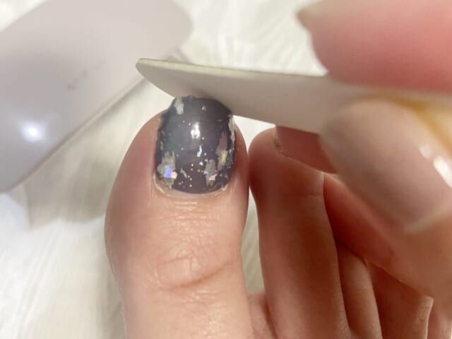 自然光に当てるとゆっくり硬化されていくので、シールを貼り終われば完成!……ですが、LEDライトやUVライトといったジェルネイルを硬化するライトを持っているのであれば使用するのがマスト。硬化ライトを当てるとより早く硬化できます。