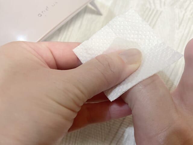 セミハードジェルネイルシールを貼る前に自分の爪の油分をふき取ります。油分の除去は、エタノールかノンアセトンリムーバーを使用します。油分をふき取ることでネイルが長持ちするので、面倒でもこの工程は省くのはNG。