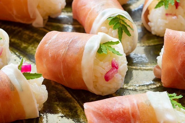 生ハムは酢飯を一周巻いて少し余るくらいの長さに切る。幅を酢飯が少しのぞくくらいに折り込み、巻き始めと巻き終わりが酢飯の下になるようにして、ぐるりと巻く。