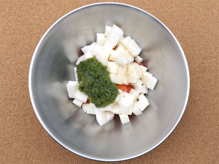 3. めかぶと付属のタレを加えて、混ぜておきます。