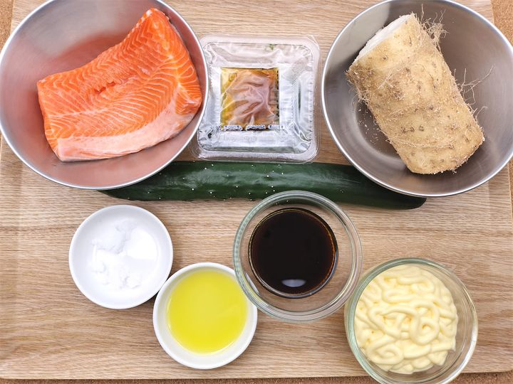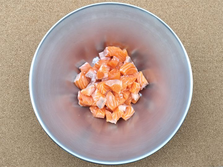 1. サーモンをキッチンペーパーで水分を取り除き、角切りにしてボウルに入れます。塩を加えて、手で揉みこみます。