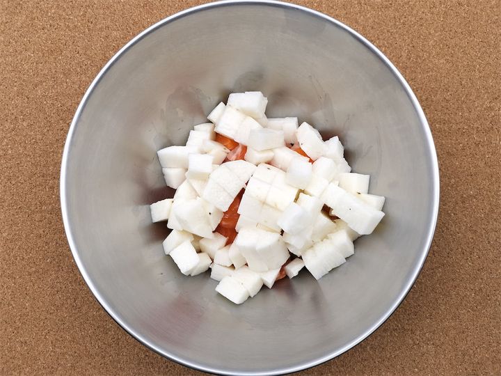 2. 長芋をサーモン同様の角切りにして、同じボウルに入れます。