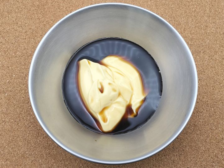 6. 別のボウルにマヨネーズとポン酢じょうゆを混ぜて、ソースを作ります。