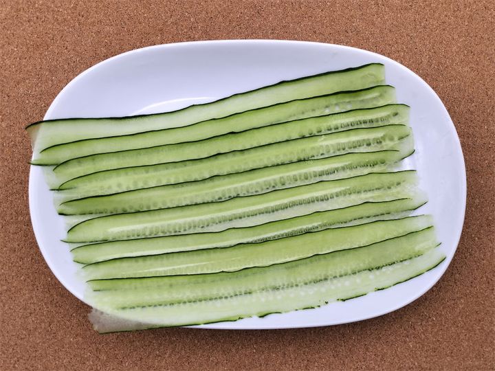 4. きゅうりの両端を切り落とし、縦に薄くスライスします。