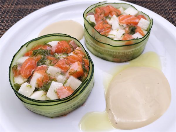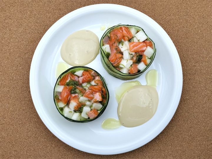 料理は見た目も大事とよく言いますが、確かにこの料理を見るとそう思います。サーモンの赤、きゅうりの緑、長芋の白とまるでイタリアの三色旗のようで華やかです。口に入れると、サーモンのねっとりとした食感に長芋のシャキシャキが加わって、牛肉のタルタルとは全く違うさっぱりとした、でもしっかり濃厚なおいしいタルタルでした。サーモンにマヨネーズが合うのはみんな知っていますが、ポン酢じょうゆの酸味が加わることでよりさわやかになり、サーモンの魚臭さも消してしまって、とてもいいバランスに仕上がりました。