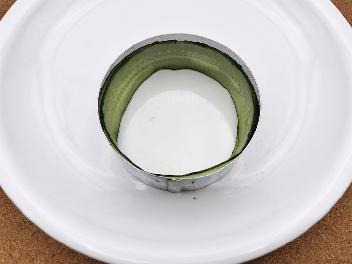 5. 皿にセルクルを置き、内側にきゅうりを貼ります。