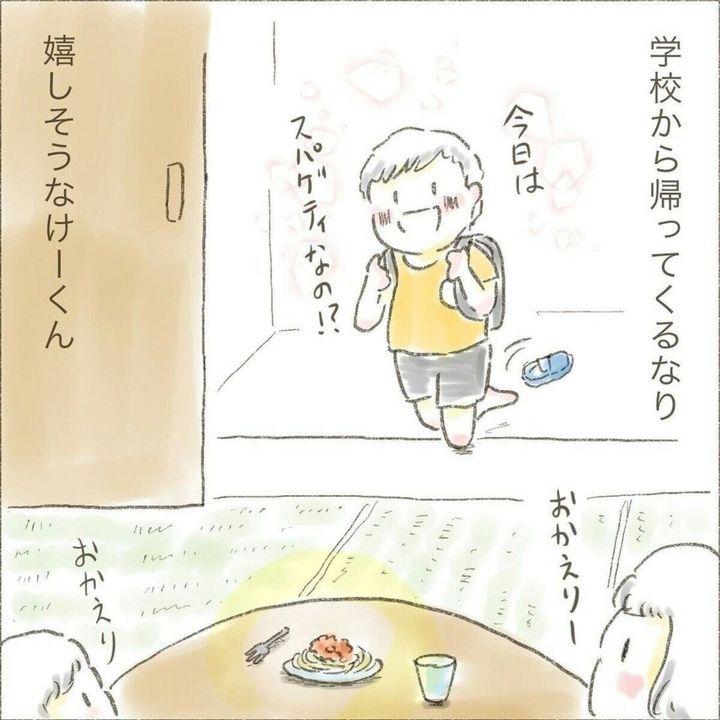 「白米の刑」が続くある日のこと。この日は昼食がスパゲティでした。米を炊くのが面倒という理由で、長男のけーくんもスパゲティにしてみると、ぽろっとかわいらしい本音を言ってくれました。