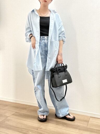 コンパクトなトップスにデニム、そこにアウター感覚でオーバーシャツをオン。メリハリのシルエットがどこかセンシュアルに仕上がり、清涼感あるブルートーンが初夏を思わせるコーデを楽しめます。デニムはストレートの延長線上くらいのゆるさが今の気分にピッタリです。