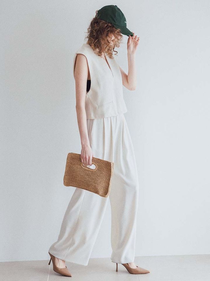 【POINT】肌にまとわりつかない、涼しくソフトな素材感。白すぎないエクリュカラーのそでなしだから、力が入りすぎずキレイに使える。グリーンキャップに女性らしい縦落ちパンツやベージュパンプスを加えて、ほどよくボーイッシュに。