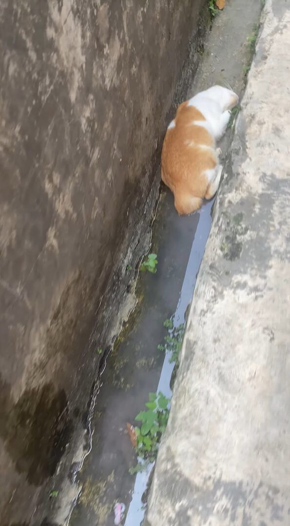それは、なんと水が流れている側溝の中だったのです!! どうやら、このネコは水をせき止めているようですl。 この子の頭の先では、側溝が渇いている事も確認できます。