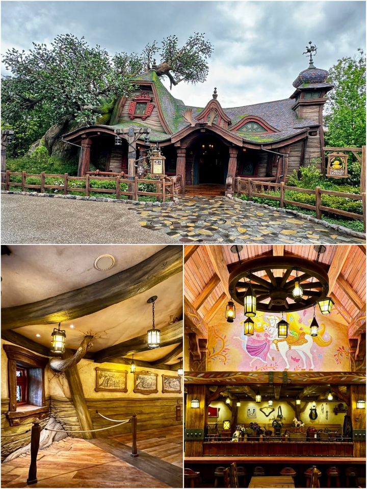 映画の中でラプンツェルが荒くれ者たちと友だちになった酒場を再現したレストラン「スナグリーダックリング」。隣に立つ巨大な木によって傾いている特徴的な建物と、入口にあるアヒルの看板が目印です。