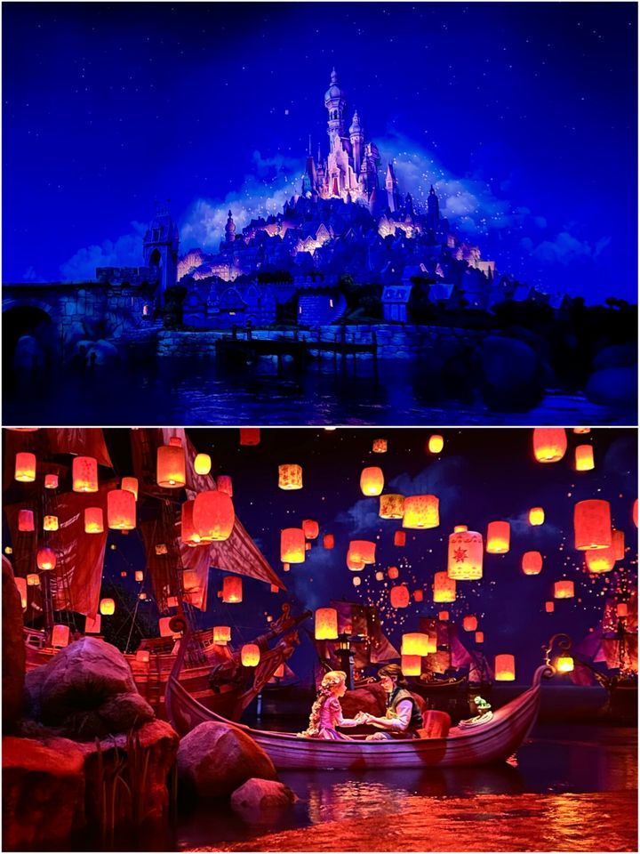 ▲洞窟を抜けると目の前にはコロナ王国の景色が広がり、「輝く未来」の冒頭部メロディーが流れはじめます。そして、ボートが湖へと進み、無数に光り輝くランタンが夜空に舞うランタンフェスティバルのシーンへ移ると、息を呑むほどの美しい光景に感動は最高潮。ゲストが乗ったボートは、ラプンツェルとフリン・ライダーが乗ったボートのまわりをゆっくりと進んでいくので、様々な角度からその光景を見ることができます。ラプンツェルの可愛い髪型もぜひチェックしてみてくださいね