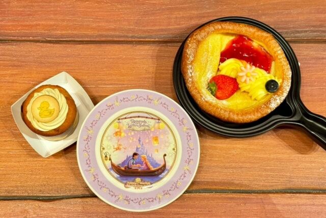 ▲お菓子作りが好きな荒くれ者が考案したマフィン「ダックリングマフィン(キャラメル)」(1個¥600)。そして、ラプンツェルが身を守るために持っていたフライパン型のお皿にのった「スウィーツエバーアフター(レモン&ストロベリー)」(¥700)は、ダッチパンケーキのような生地に、レモンクリームやフルーツがのった、映画の世界観も楽しめるスウィーツ。また、水面にうかぶボートに乗るラプンツェルたちの上にランタンが飛んでいる幻想的なシーンがデザインされたスーベニアプレート(対象メニューにプラス¥650)もゲットしておきたいアイテムです