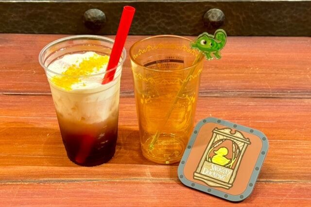 ▲ラプンツェルをイメージしたミルクティー「ラプンツェルのマジカルミルクティー」(1杯¥800)は、紅茶のシロップとホイップクリームを混ぜて、エルダーフラワーの華やかな香りとともに楽しめる見た目も可愛いドリンク。また、「スナグリーダックリング」の看板のデザインのコースターと、ランタンフェスティバルのシーンやコロナ王国の紋章がデザインされたタンブラー&パスカルのマドラーがセットになった「スーベニアタンブラーセット」は、対象のソフトドリンクにプラス¥1,400で付けられます